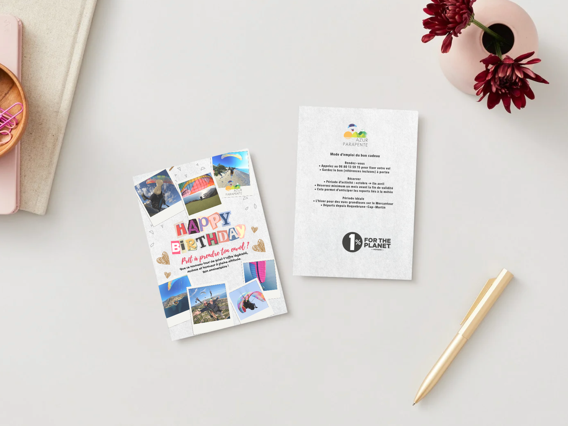 - Un explicatif avec nos coordonnées, pour que la personne qui reçoit le cadeau puisse rapidement réserver son vol en parapente.